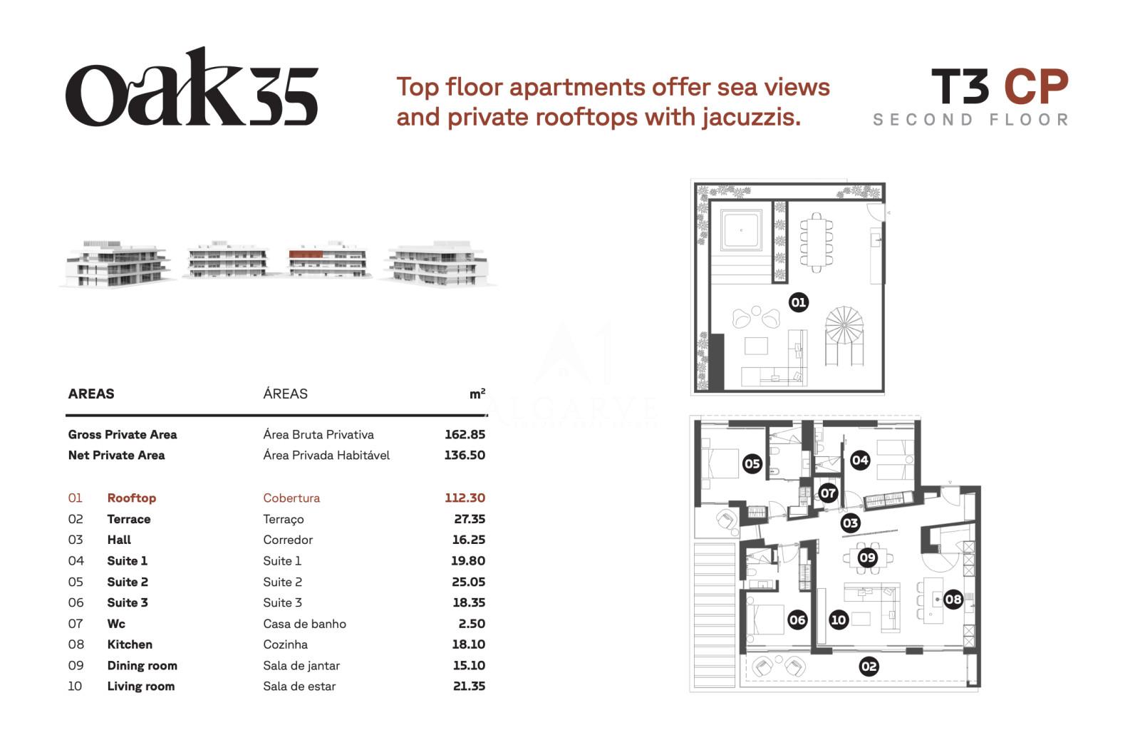 Erleben Sie die perfekte Mischung aus zeitgenössischer Eleganz und natürlichem Komfort im Oak35, einer Boutique-Wohnanlage im Herzen von Vilamoura. Dieses Apartment in der obersten Etage im Gebäude C verfügt über eine exklusive Dachterrasse mit privatem Whirlpool und Terrassen, die einen atemberaubenden Panoramablick auf das Meer und hervorragende Sonneneinstrahlung bietet.